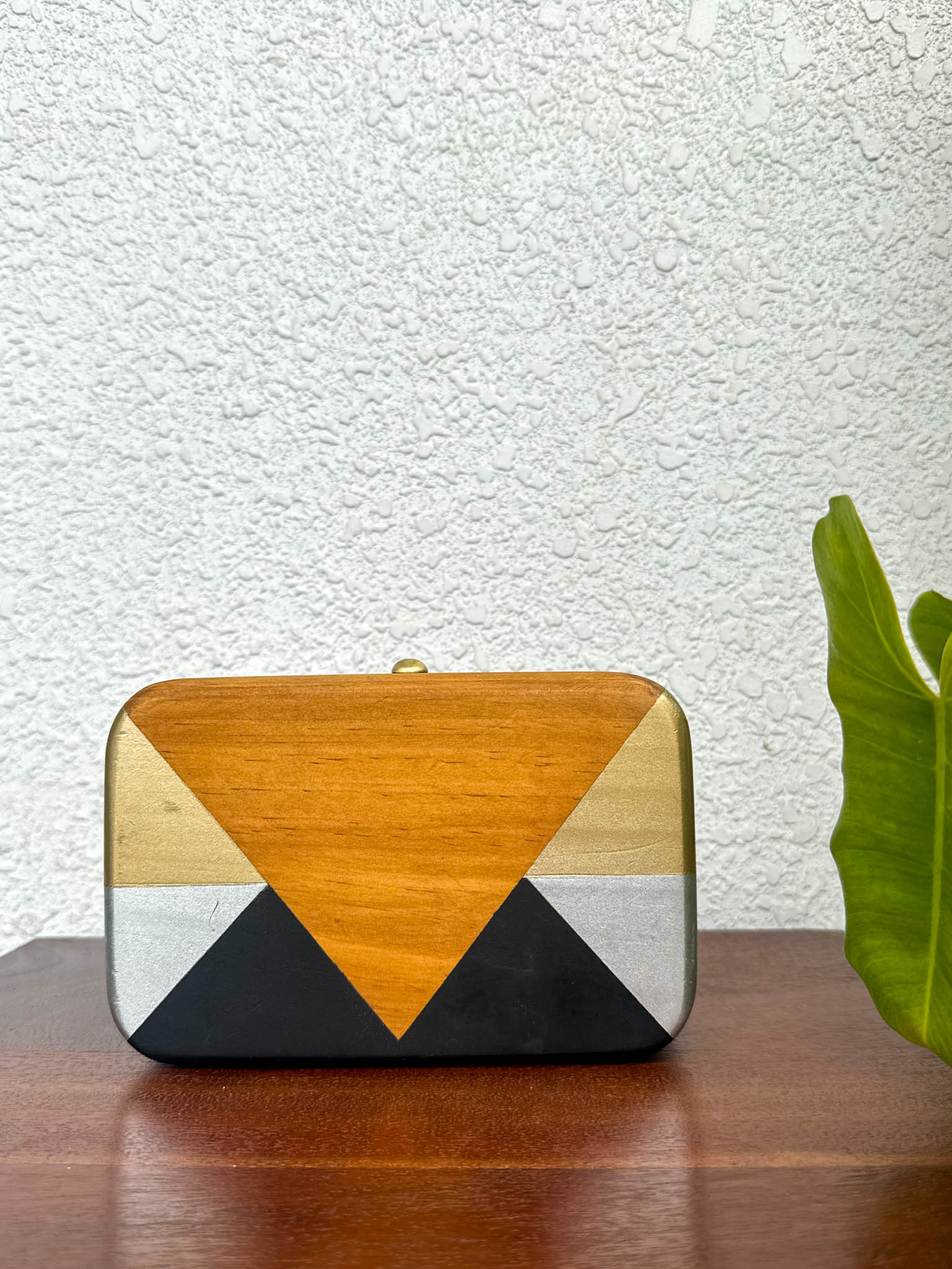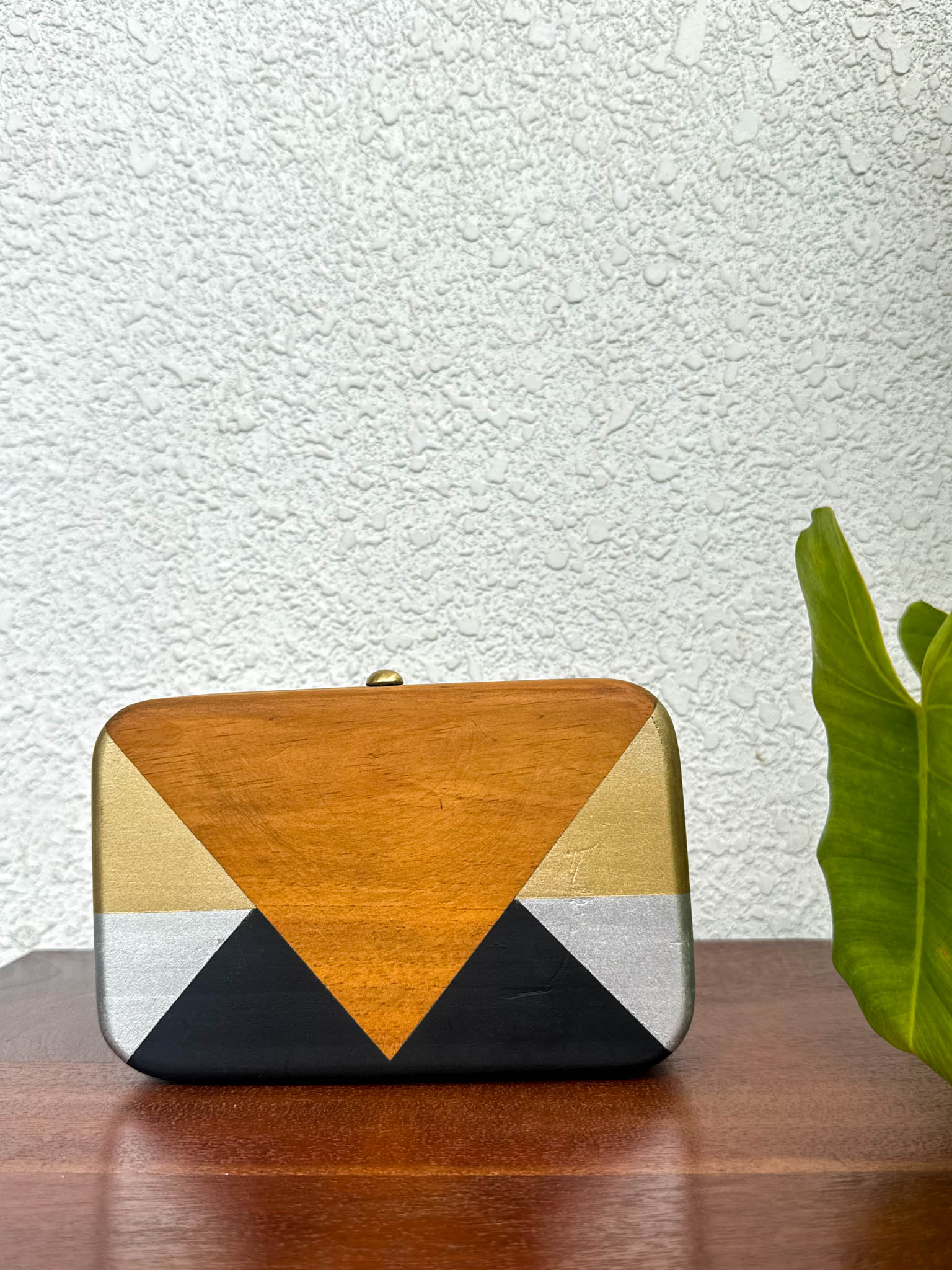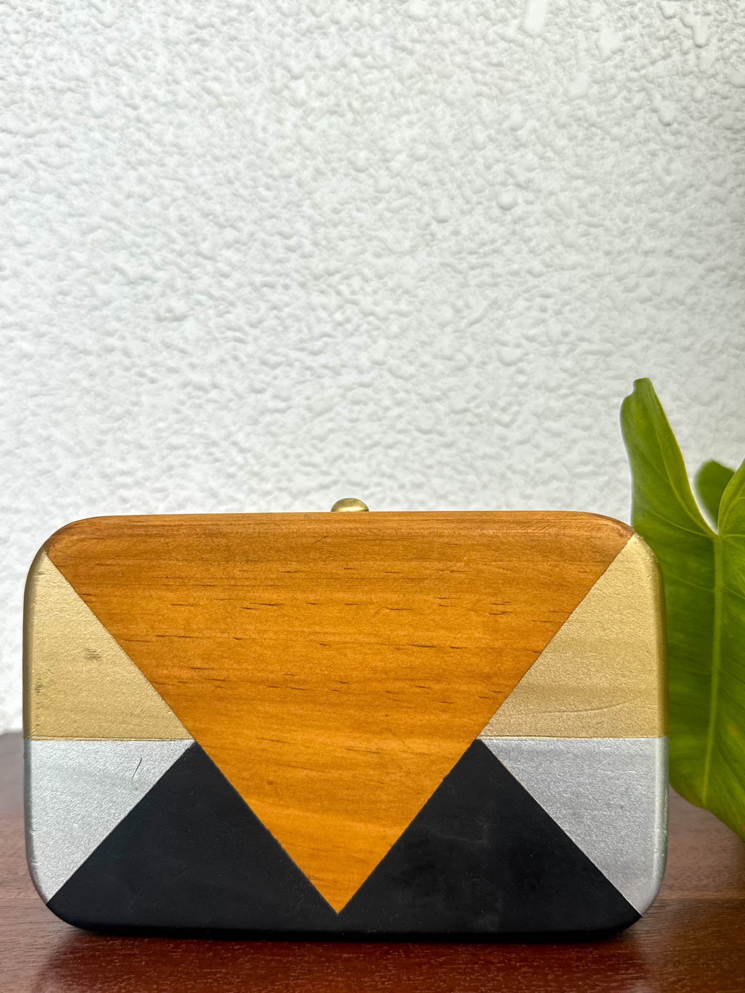 • From our 2016 archives — a double-sided, geometric pattern painted wooden clutch with a magnetic closure and brass clasp.