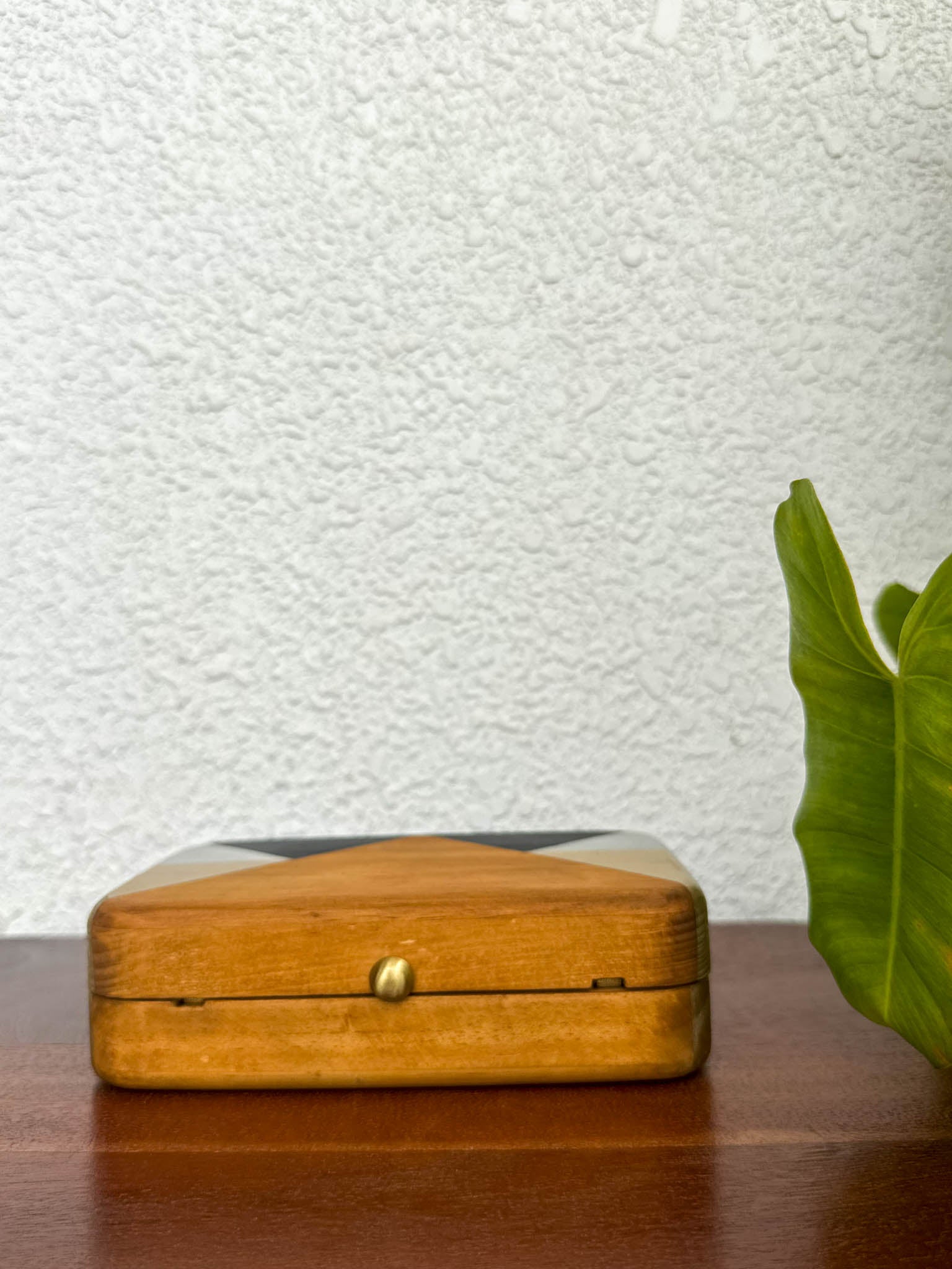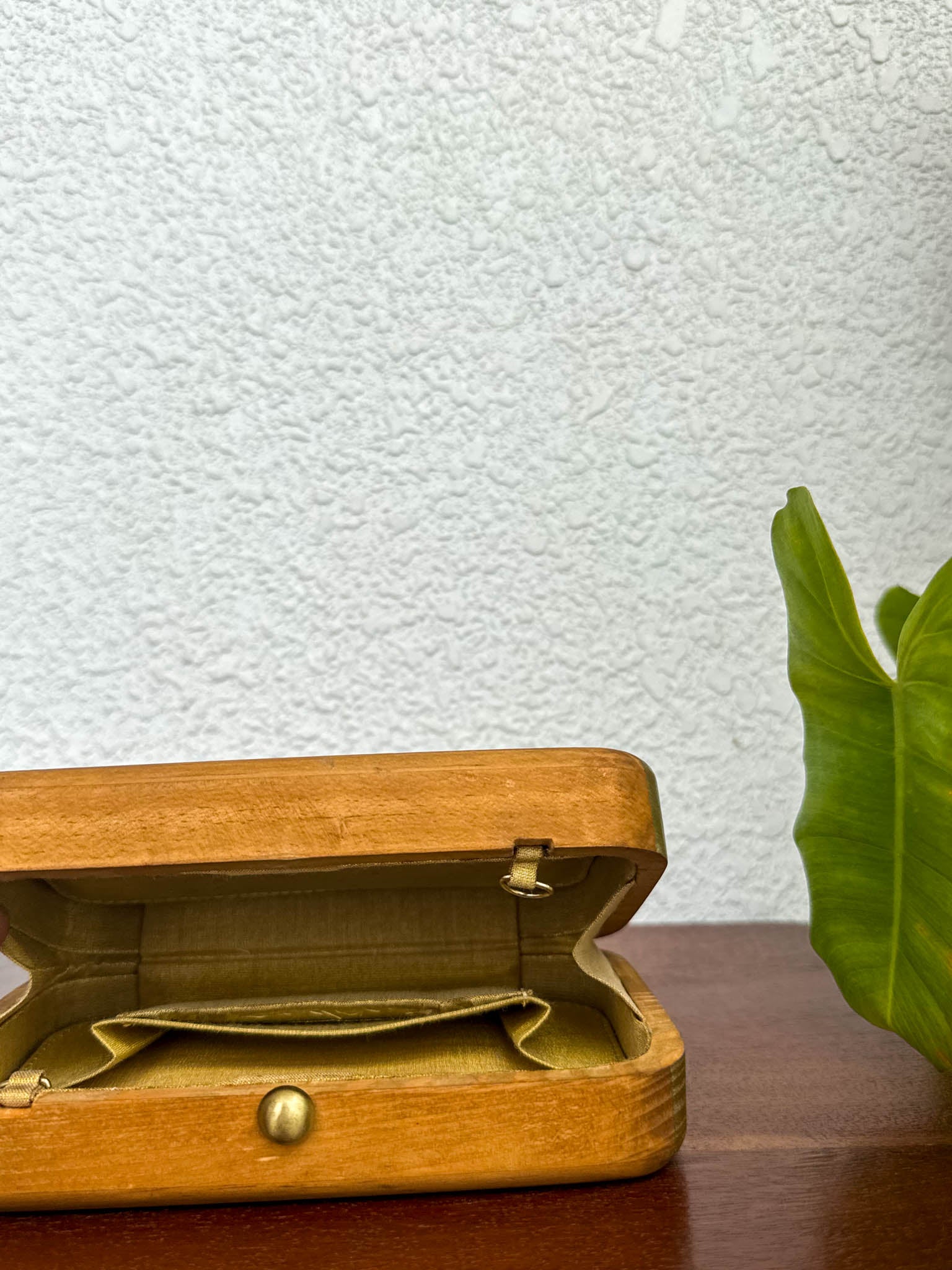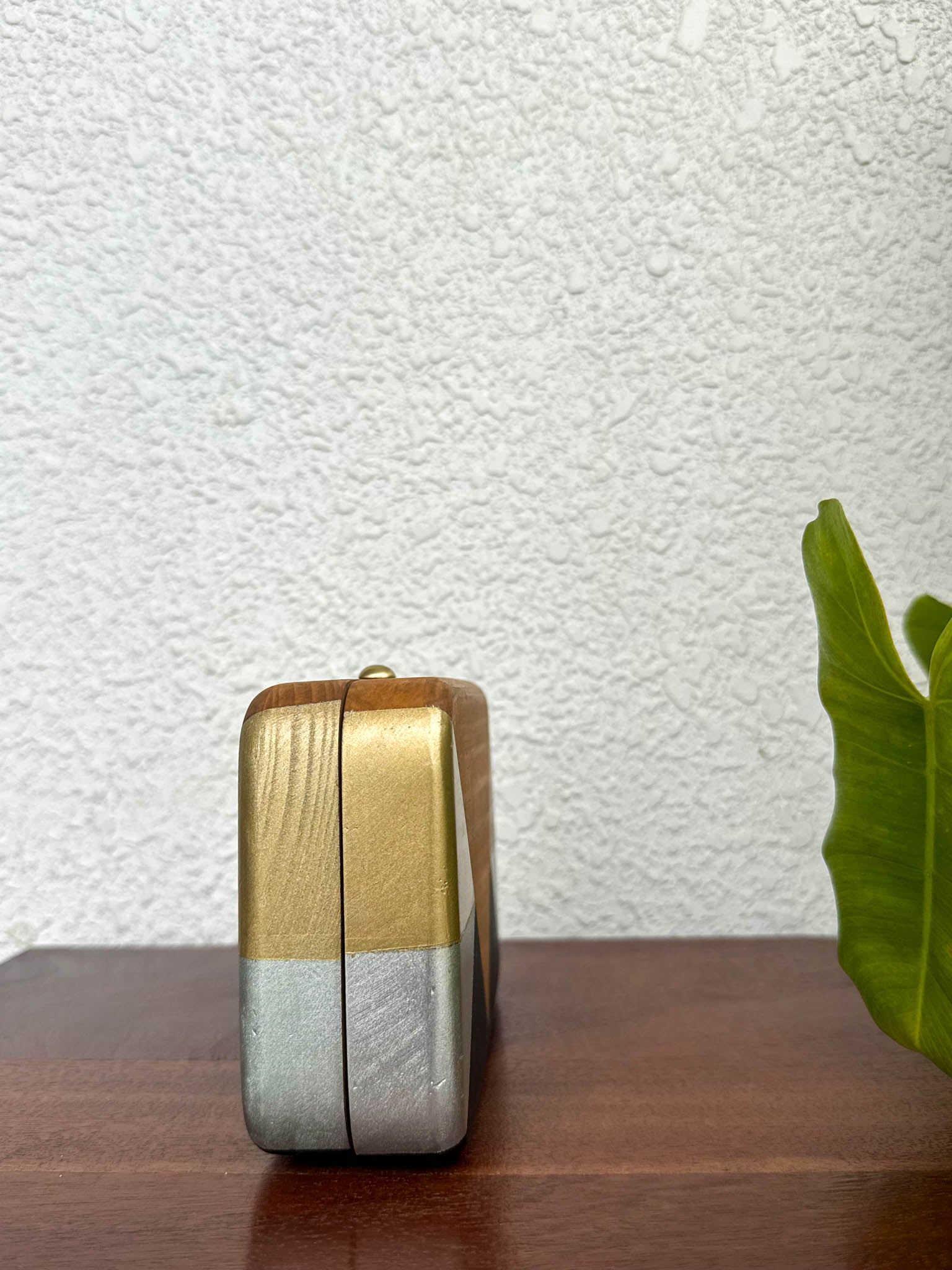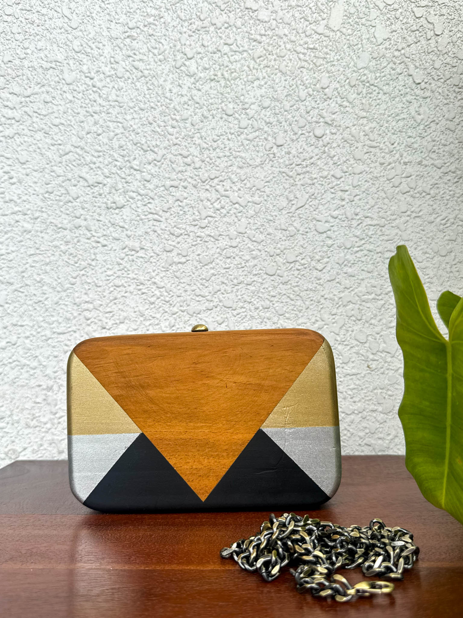 • From our 2016 archives — a double-sided, geometric pattern painted wooden clutch with a magnetic closure and brass clasp.