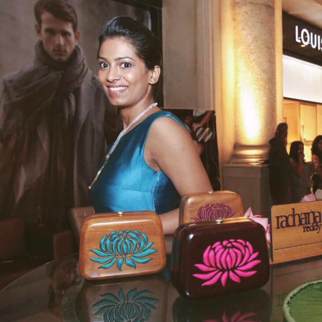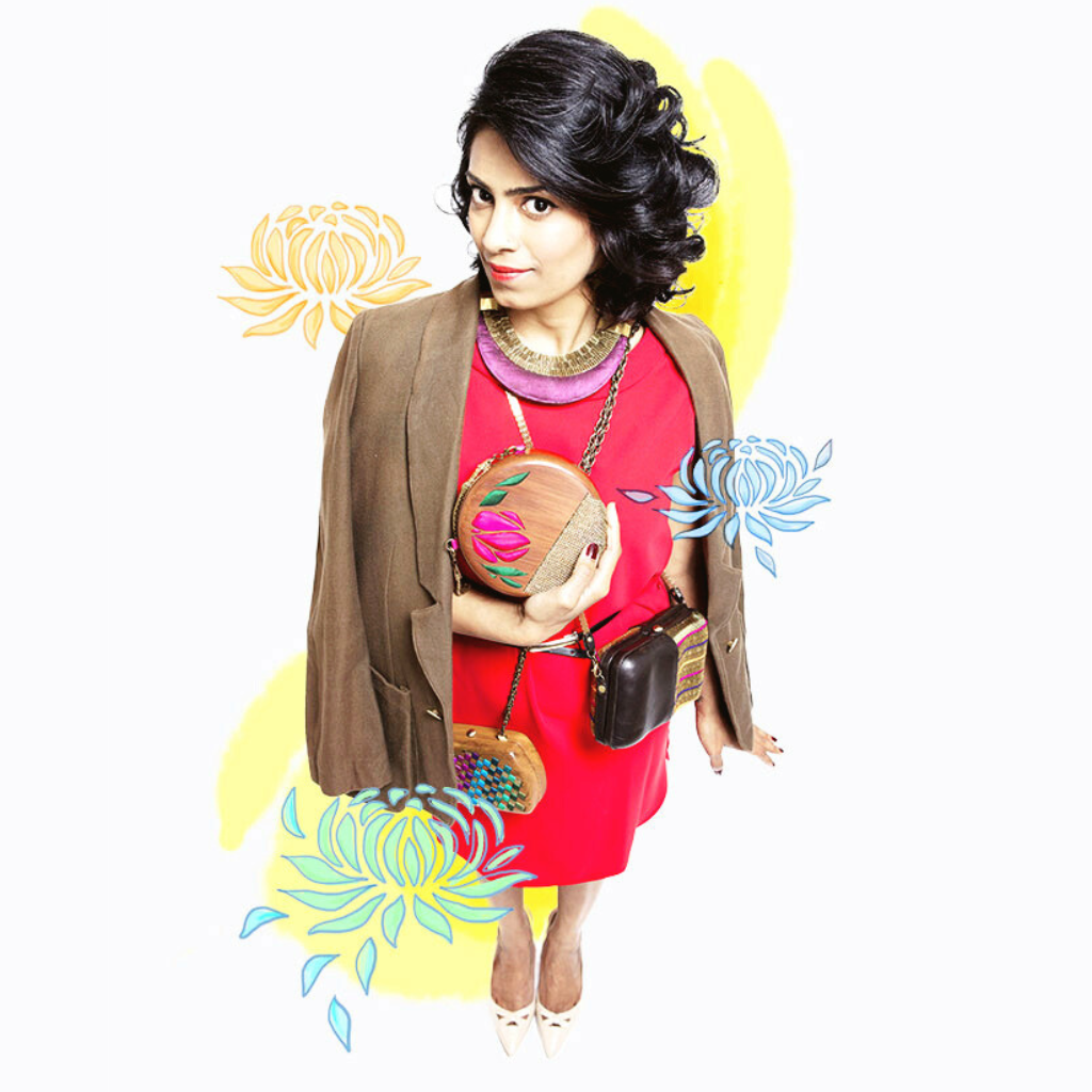 "Her elegant clutches made from wood with singular motifs in silk, were a sellout the minute they hit shelves." - Indian express