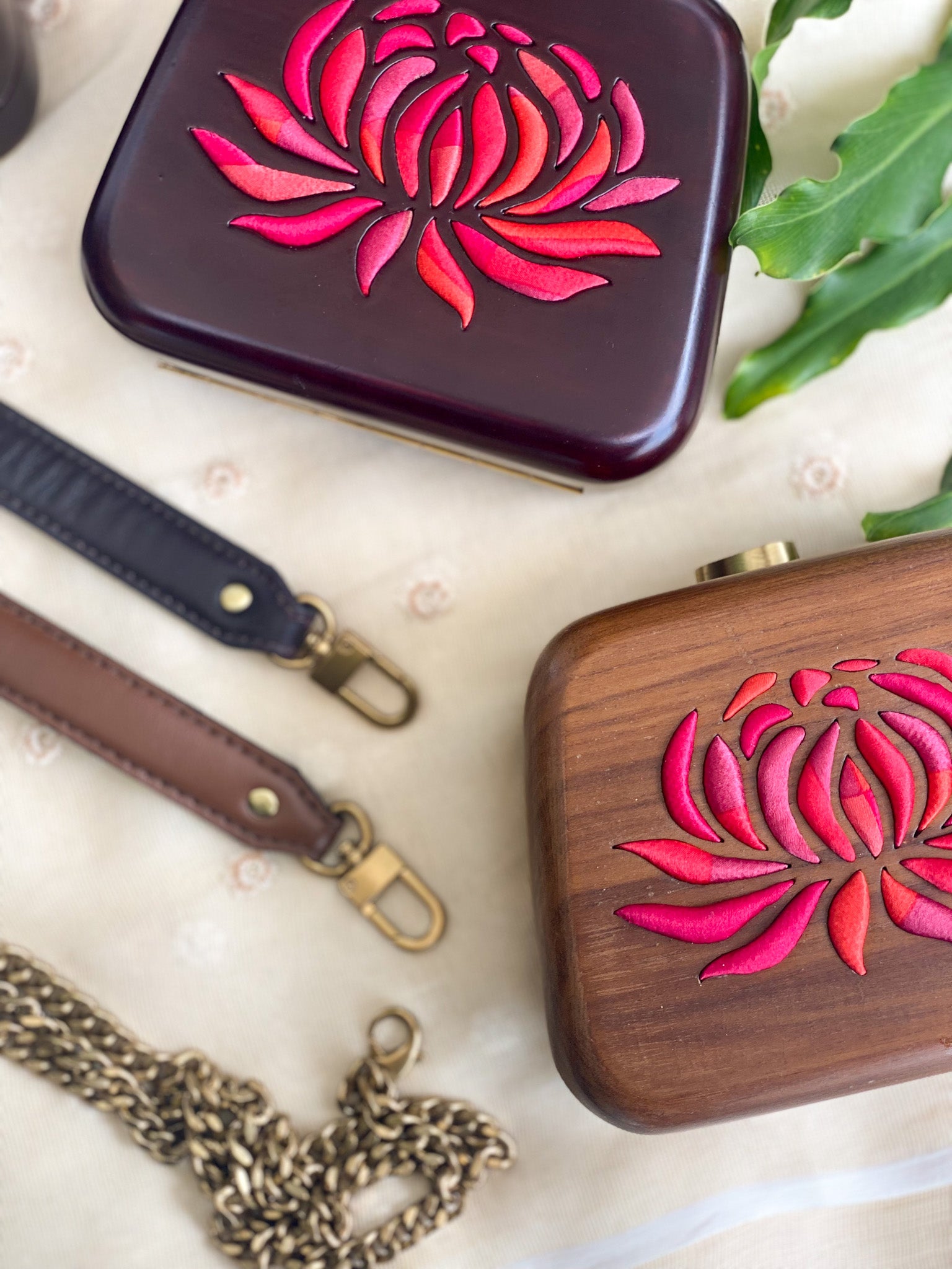 The natural teak wood used in the making of these clutches has a varying grain structure resulting in different surface patterns and slight variations in color, making each piece unique and special in its own way.